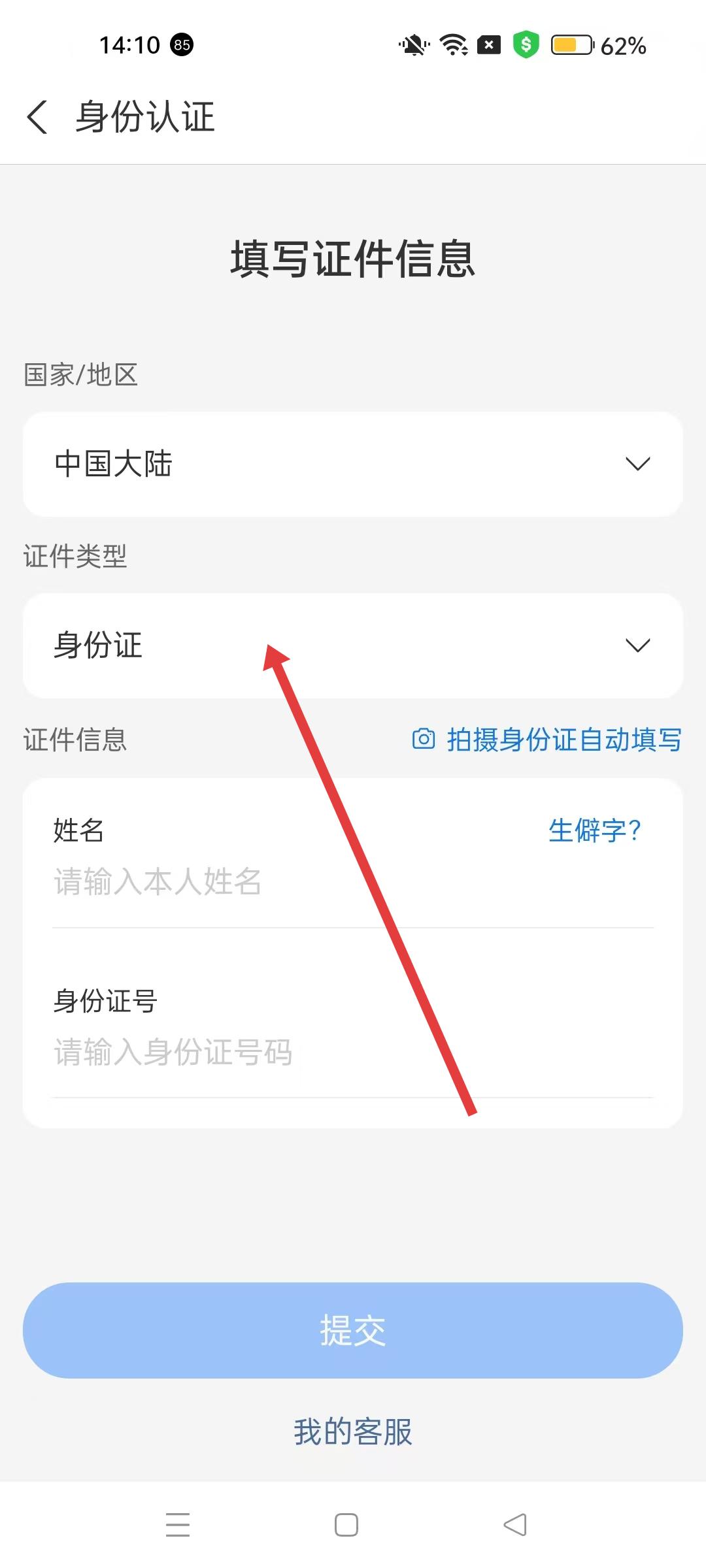 4、身份認證頁面選擇中國大陸地區,證件類型選擇身份證,填寫本人姓名和身份證號碼,點擊提交,完成實名認證。