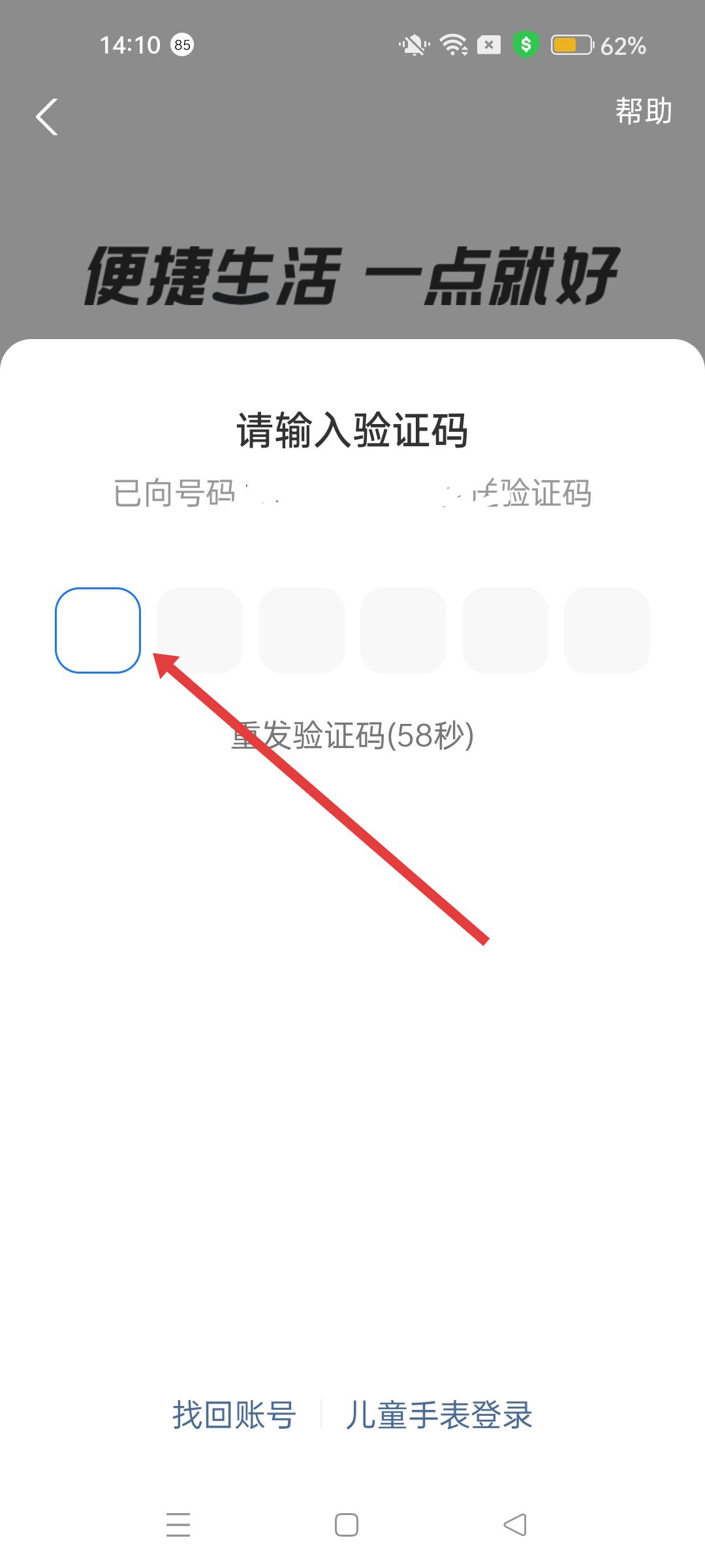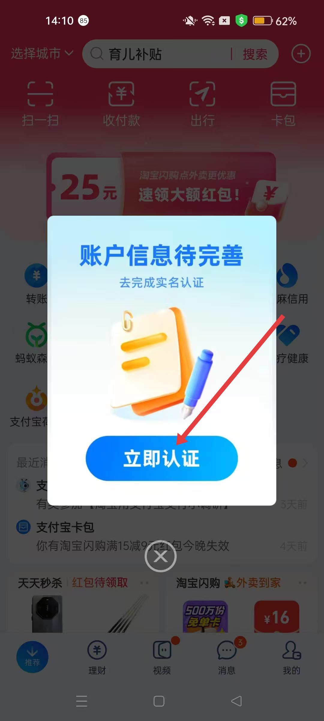 2、輸入收到的驗證碼,完成手機號碼驗證,進入支付寶首頁。