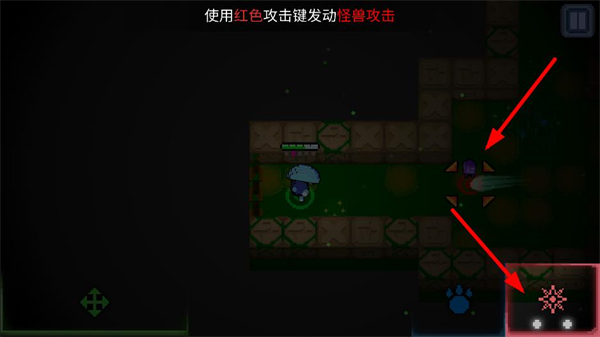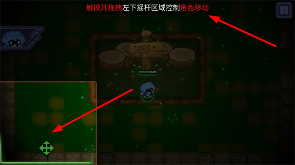 1、觸摸并拖拽左下搖桿區域控制角色移動,在像素場景探索,熟悉角色移動操作,為冒險和戰斗做好準備。