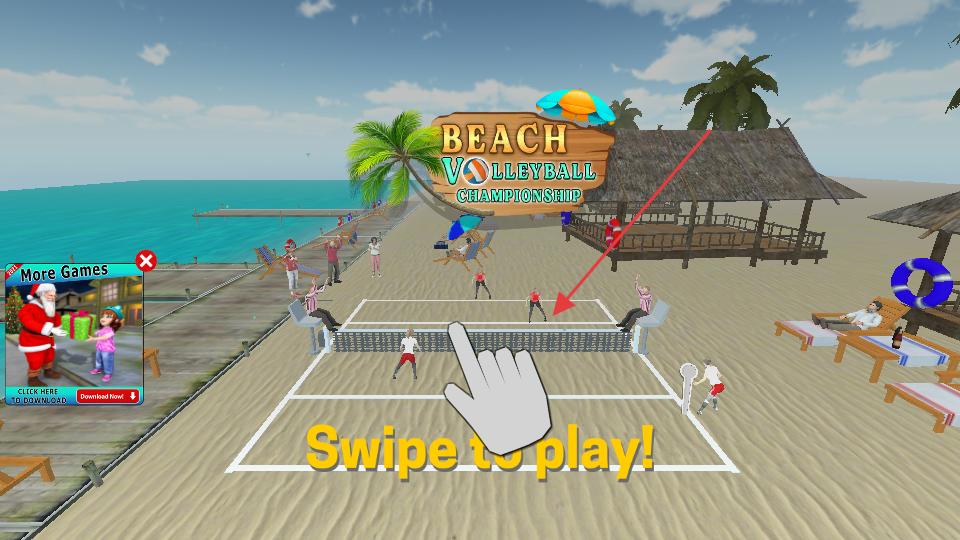 3、進入比賽場景后看到屏幕中滑動來游玩的提示,按照提示滑動屏幕,操控角色進行排球的擊打動作,開啟沙灘排球的對戰。