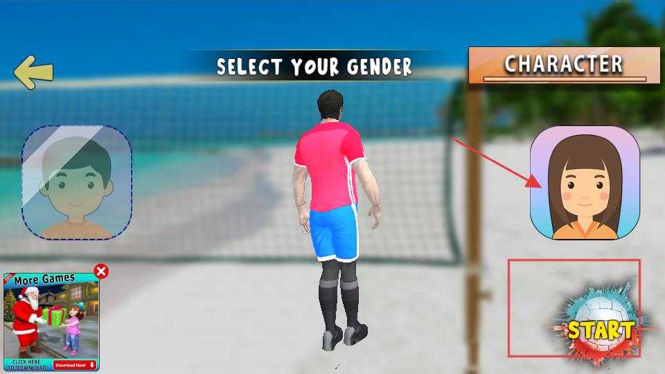 2、在角色選擇界面選擇想要使用的角色形象,選好后點擊下方的START按鈕,進入沙灘排球的比賽場景,準備開始比賽。