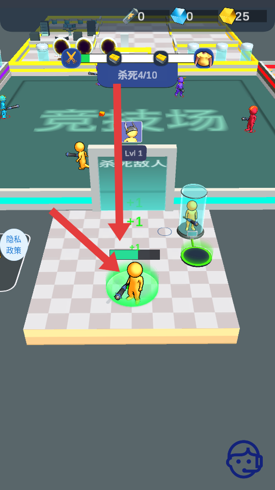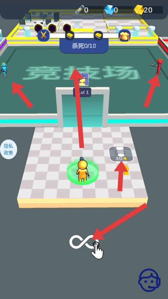 1、進入競技場,目標是殺死10個敵人,點擊下方無限符號類按鈕,操控角色移動,尋找敵人展開戰斗。