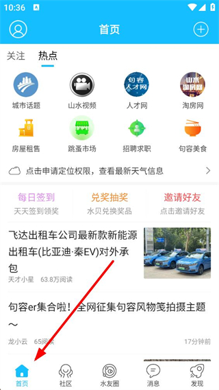 1、進入應用后首頁可瀏覽熱點資訊,還有城市話題、山水視頻等功能入口,能參與每日簽到、兌獎抽獎等活動,獲取本地生活服務信息。