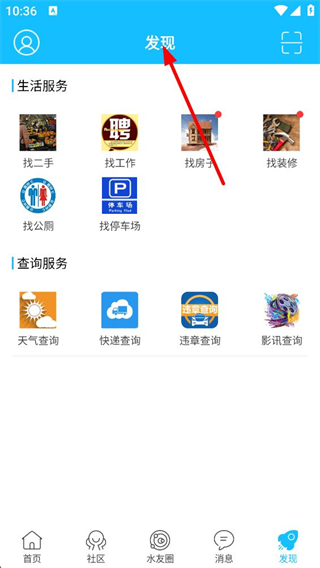 3、點擊底部發現按鈕,進入發現界面,可使用找二手、找工作等生活服務,以及天氣查詢、快遞查詢等查詢服務,滿足多樣生活需求。