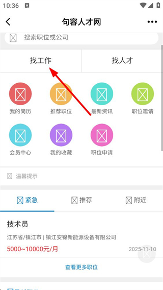 4、進入句容人才網界面,可搜索職位或公司,找工作板塊使用我的簡歷、推薦職位等功能,查看緊急、推薦、附近的職位信息,助力求職。