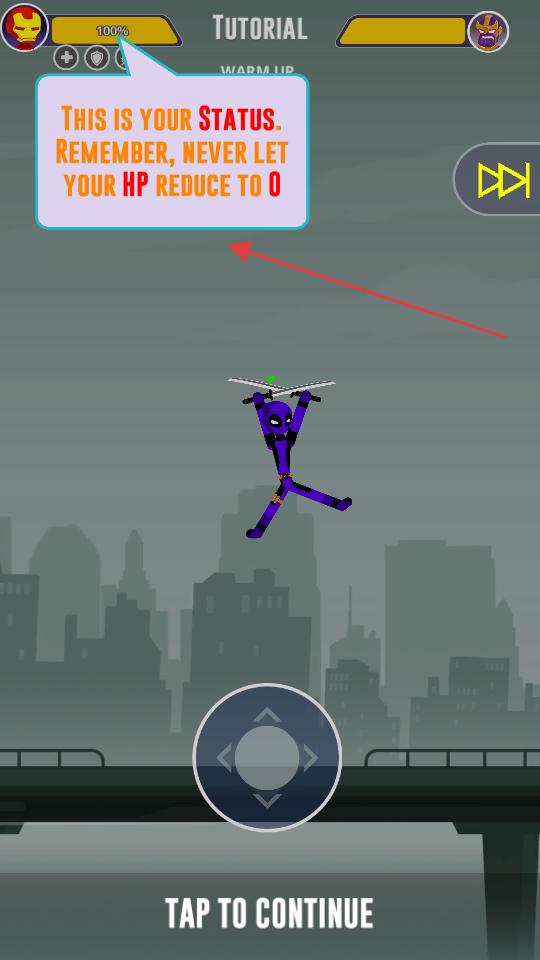3、看到關于生命值狀態的提示,了解要避免生命值降為0,然后點擊下方點擊繼續的提示,進入后續的格斗實戰環節,準備與對手戰斗。