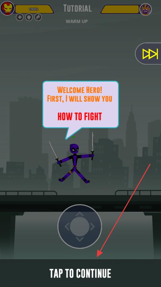 1、進入游戲教程界面看到下方點擊繼續的提示,點擊該提示,進入下一步操作指引,此時會展示如何戰斗的說明,準備學習格斗操作。