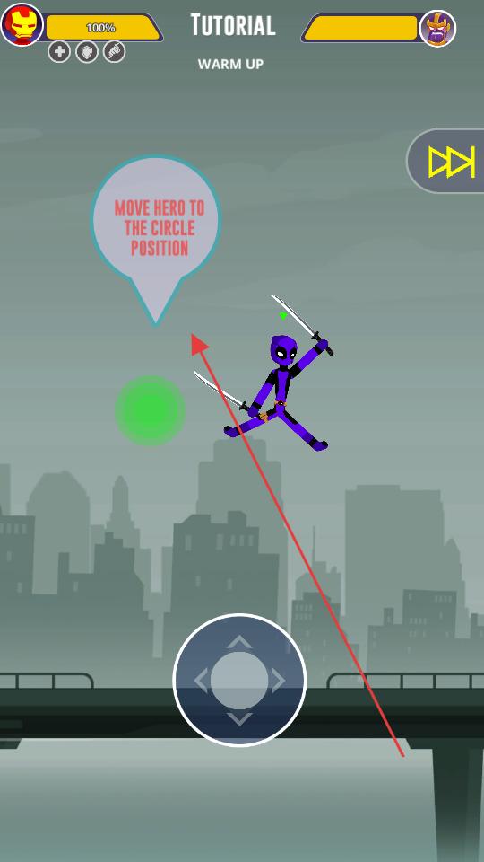 2、根據操作指引使用下方的方向鍵,操控紫色火柴人英雄移動,將其移動到綠色圓圈標注的位置,熟悉英雄的移動操作方式,為后續格斗做準備。