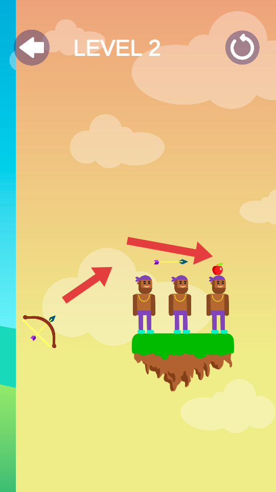 4、到第二關時,面對多個頭頂有蘋果的人物,調整弓箭,瞄準其中一個人物頭頂的蘋果,發射箭矢,完成射擊。