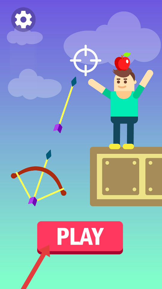 1、點擊PLAY按鈕,進入游戲,操控弓箭瞄準人物頭頂的蘋果,準備射擊,開啟射箭挑戰的第一關。