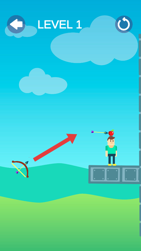 2、在第一關游戲界面,調整弓箭角度和力度,發射箭矢,精準射中人物頭頂的蘋果,完成這一關卡的射擊任務。