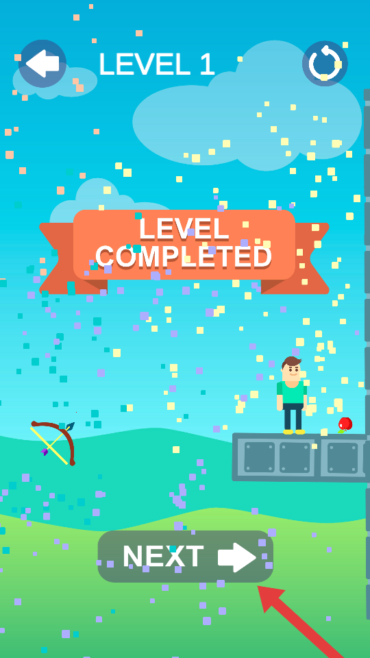 3、成功射中蘋果后,界面顯示通過關卡,點擊NEXT按鈕,進入下一個射箭關卡,繼續挑戰。