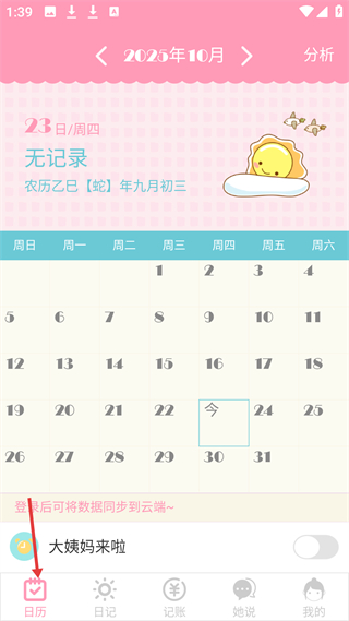 1、日歷板塊可查看日期,記錄姨媽周期,數據可同步云端,方便用戶精準管理生理周期,還能查看農歷,功能實用且細節貼心。