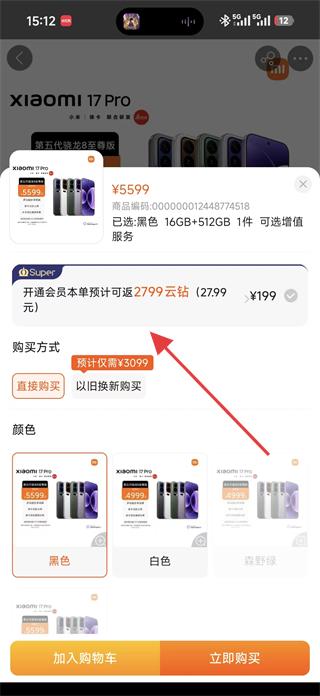 4、選擇好購買方式、顏色等后,確認商品信息無誤,可根據需要選擇開通會員等增值服務。