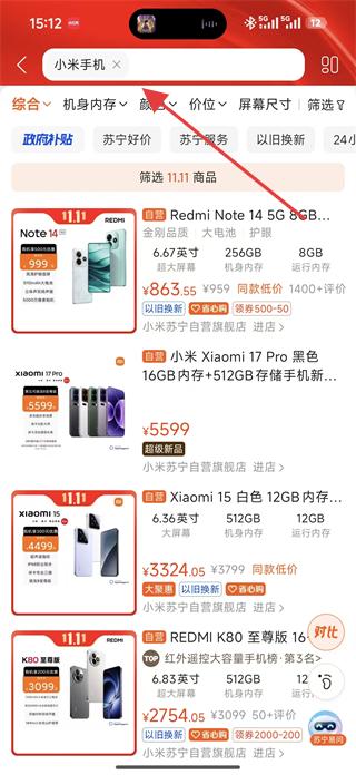 1、打開蘇寧易購app,在搜索欄輸入小米手機,點擊搜索進入小米手機商品列表頁面,瀏覽各類小米手機及價格等信息。