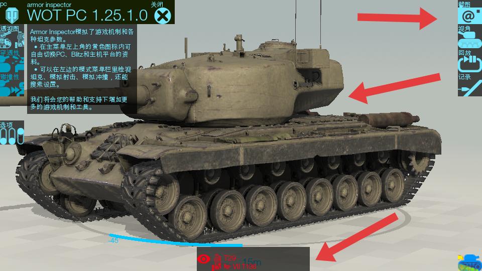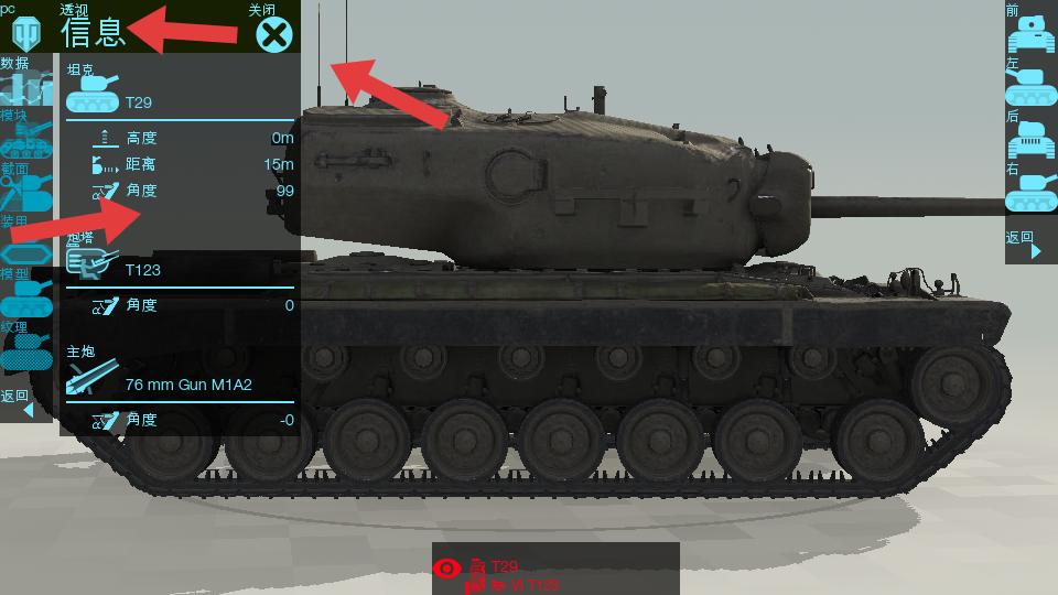 2、在左邊模式菜單欄,可查看坦克信息,像坦克高度,距離,角度等數據都能看到,還能模擬射擊,模擬沖撞,進行相關設置。