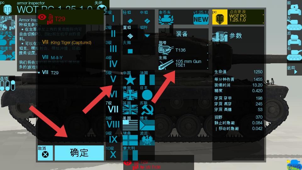 3、可選擇不同國家,等級的坦克,查看坦克的裝備,如炮塔,主炮等,還有生命值,每分鐘傷害等參數,了解坦克性能。