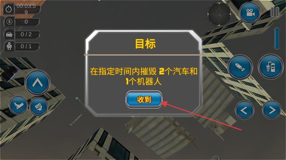 3、進入任務后會彈出目標提示框,提示需在指定時間內摧毀2個汽車和1個機器人,點擊收到按鈕,正式開始執行任務。