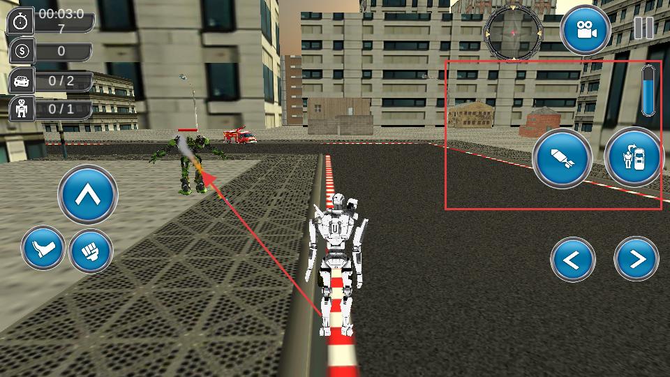 4、發現綠色機器人等敵人后,靠近并點擊攻擊按鈕進行戰斗,同時留意周圍的汽車目標,摧毀指定數量的汽車和機器人,就能完成任務并獲取獎勵。