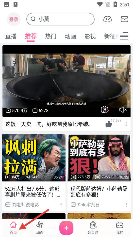 1、點擊首頁,含直播、推薦等頻道,展示多樣視頻,如美食制作與影視點評,數據醒目,吸引點擊。