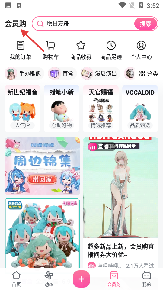 2、點擊會員購頁面,可搜索商品,涵蓋手辦雕像、盲盒等分類,展示熱門IP周邊,有直播間樣品展示。