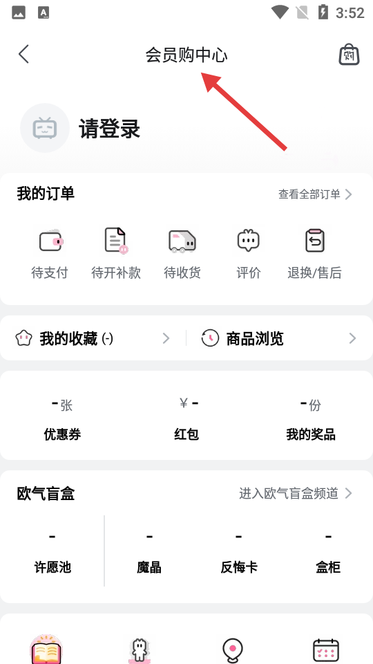 3、點擊會員購中心頁,需登錄操作,集成訂單管理、收藏瀏覽功能,設優惠券、歐氣盲盒等板塊,方便用戶購物。