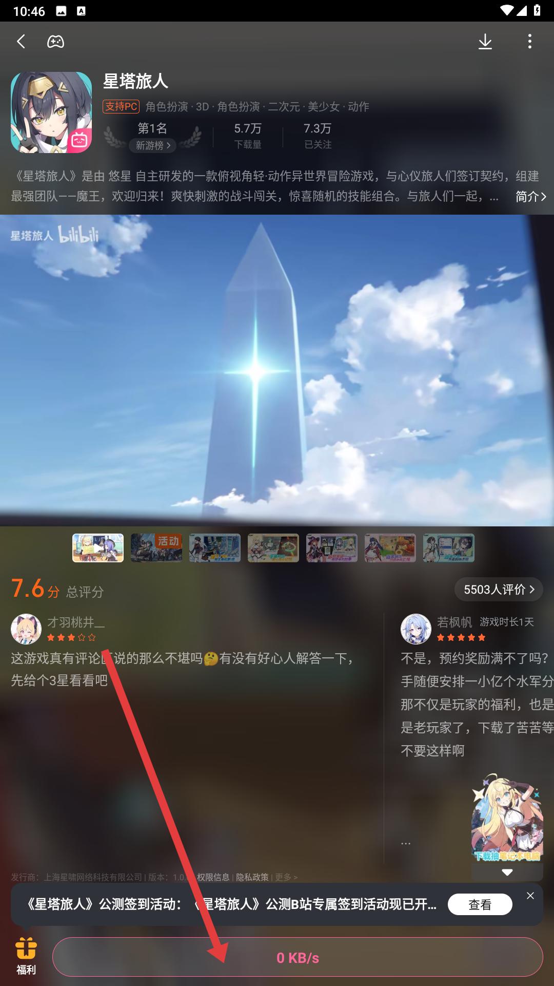 4、點擊后進入星塔旅人詳情頁,頁面下方會顯示下載進度,等待下載完成即可。