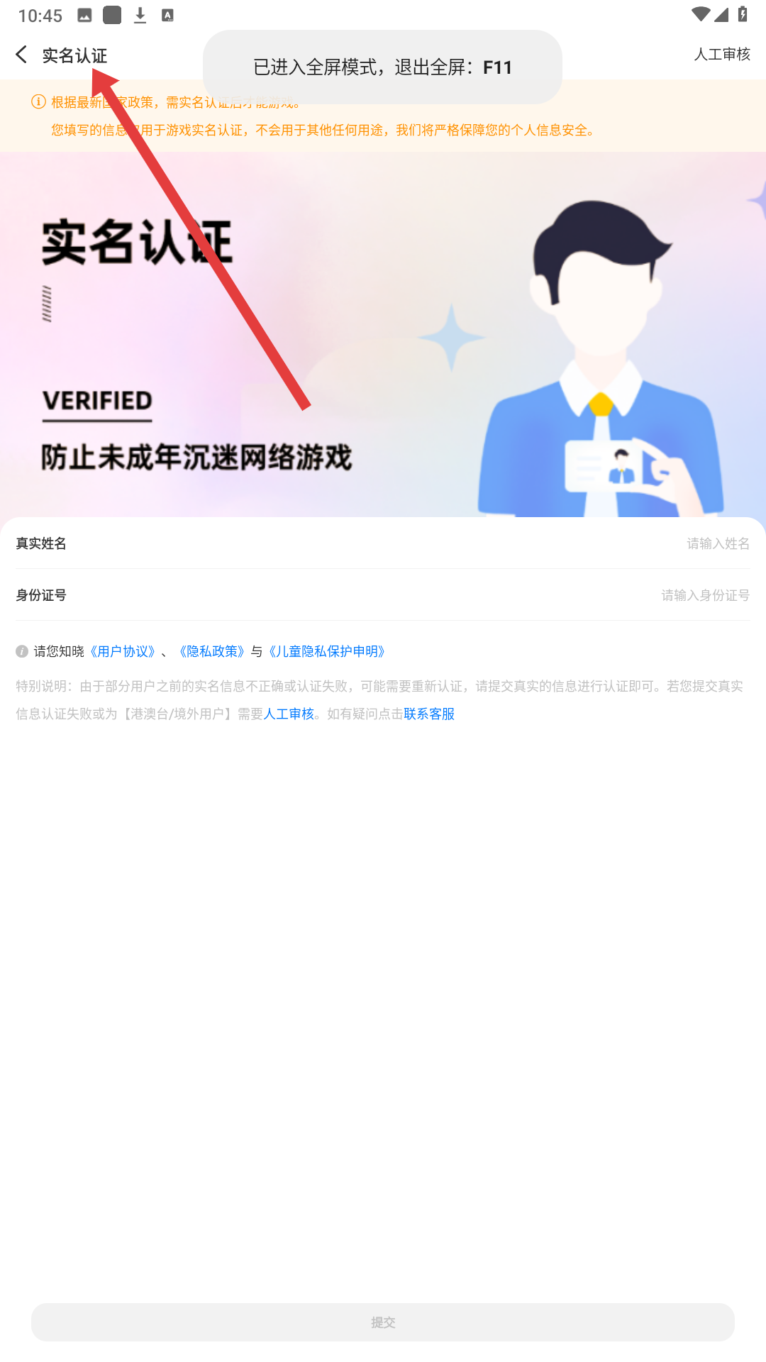 4、實名認證頁面,輸入真實姓名和身份證號,提交后完成認證,即可繼續獲取游戲。