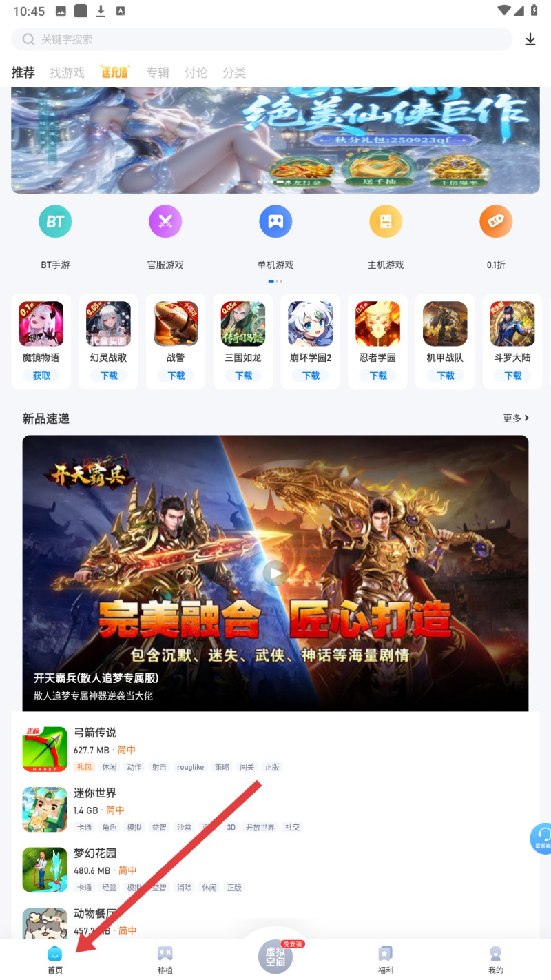 1、游戲平臺首頁,可瀏覽BT手游、單機游戲等分類,還有新品速遞板塊推薦的游戲,方便查找感興趣的游戲。
