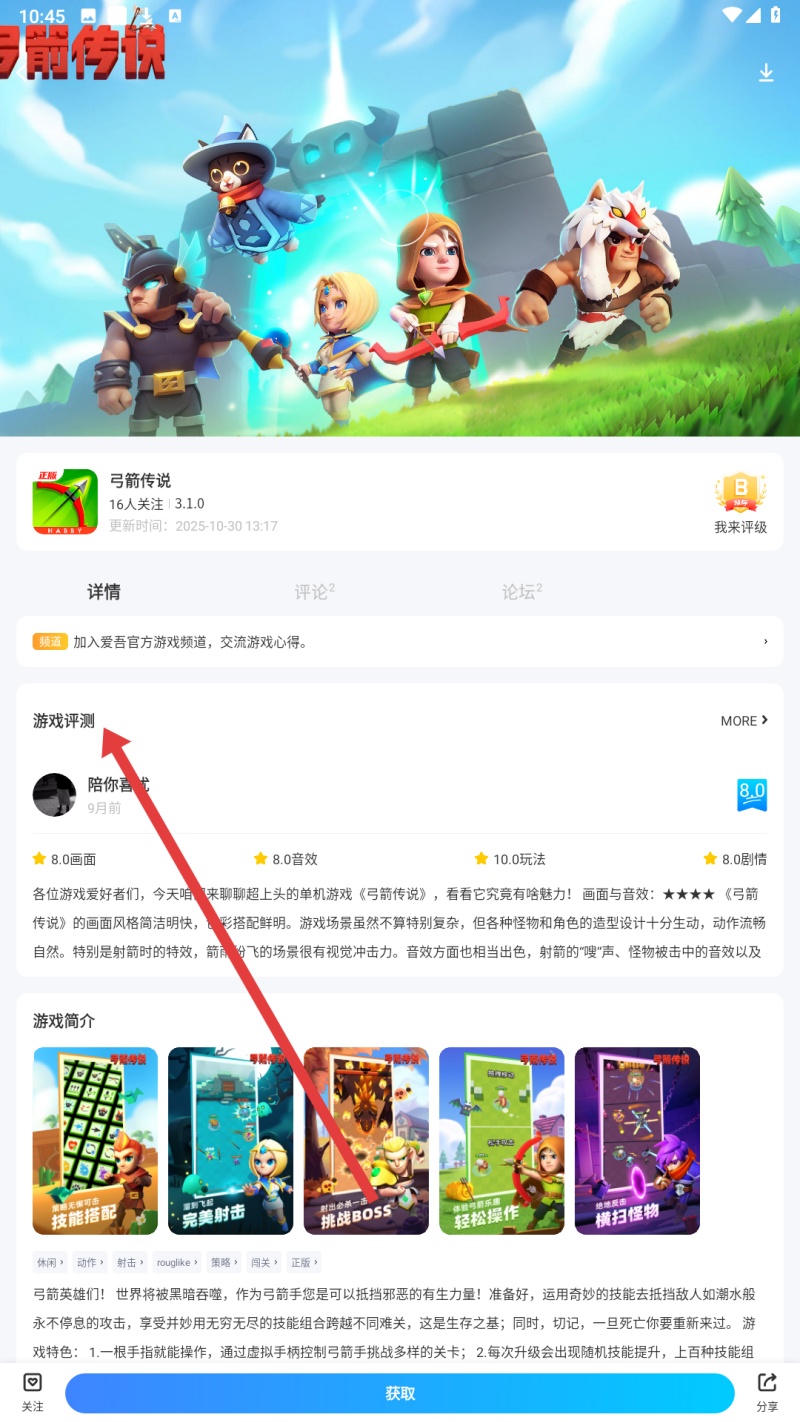2、進入弓箭傳說游戲詳情頁,可查看游戲評測、簡介等信息,了解游戲畫面、音效、玩法等評分情況。