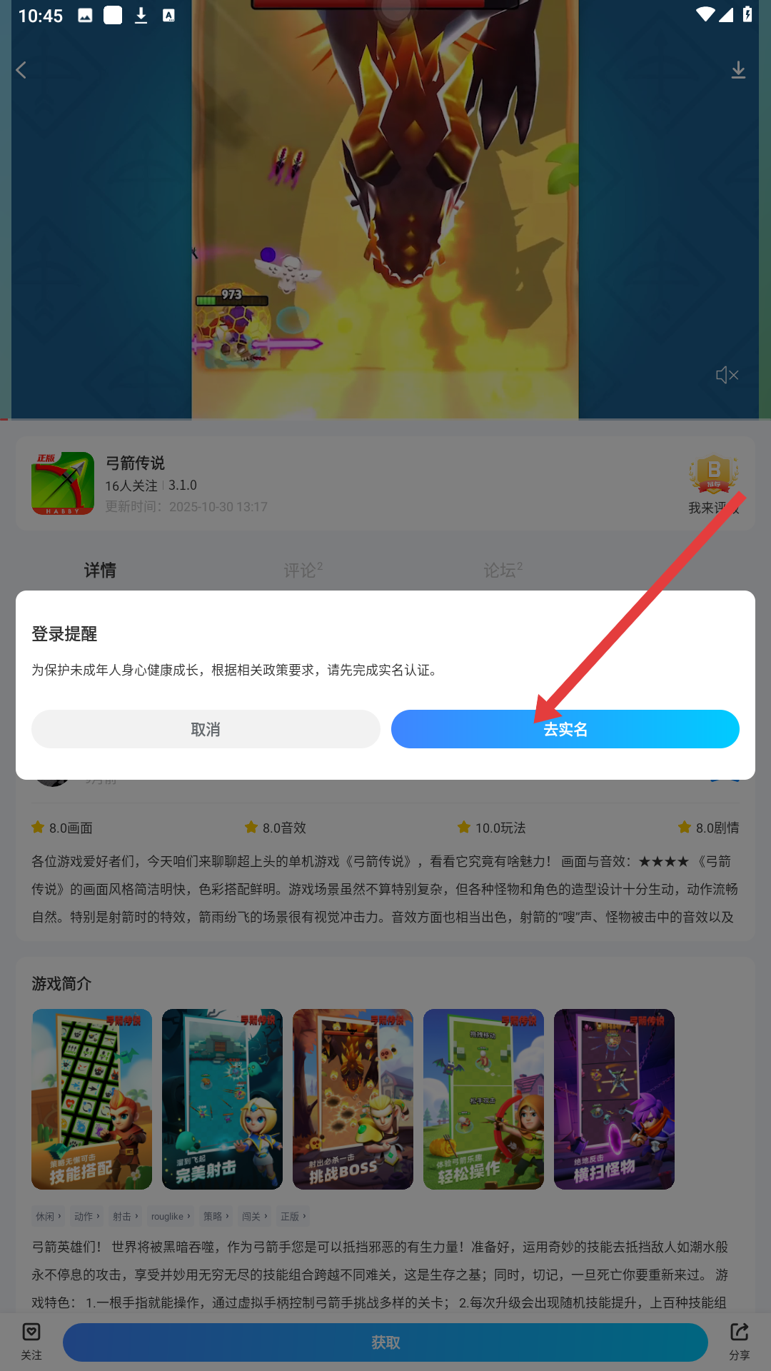 3、若要獲取游戲,會彈出登錄提醒,提示需完成實名認證,點擊去實名可進入認證頁面。