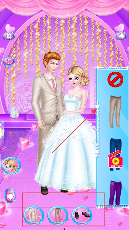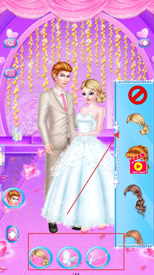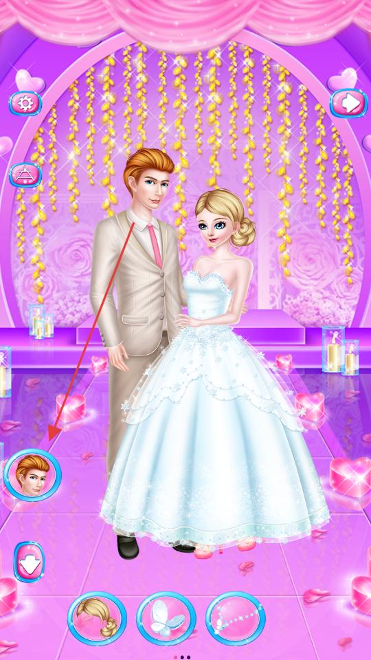 1、進入婚禮裝扮場景,點擊左側人物頭像切換裝扮對象,下方有發型、配飾等按鈕,選擇不同元素為角色搭配,打造婚禮造型。