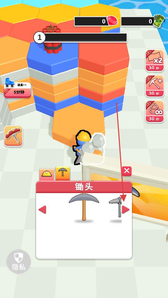 4、點擊工具界面可選擇不同鋤頭工具,更換更高級的鋤頭能提升挖掘效率,加快方塊清理速度,更高效地獲取資源和金錢。