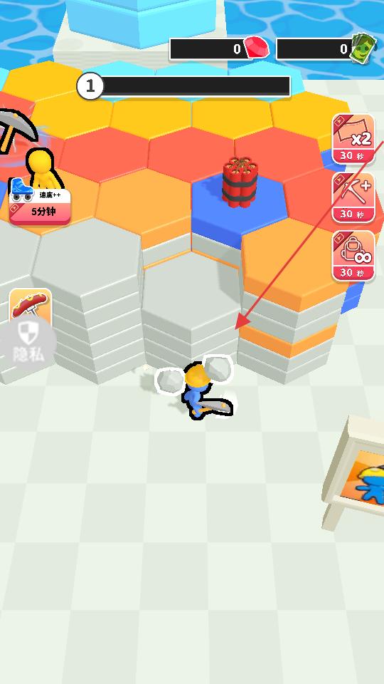1、操控藍色小人在六邊形方塊區域挖掘,遇到帶炸藥桶的方塊,利用爆炸效果快速清理周圍方塊,獲取更多挖掘空間和資源。
