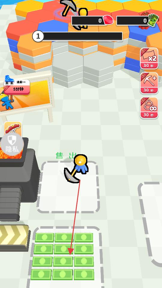 2、挖掘得到資源后移動小人將資源帶到標有售出的白色區域,把資源放入該區域,就能兌換成金錢,積累資金用于后續操作。