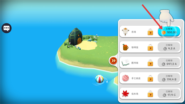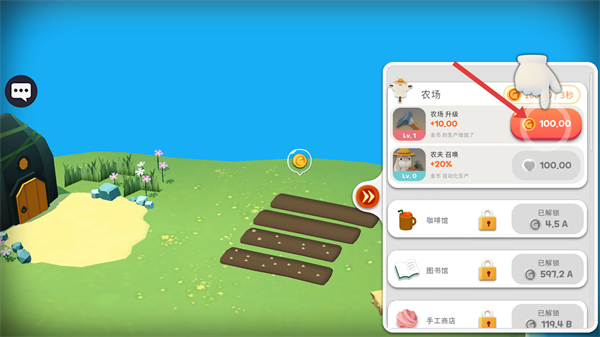 3、在建造選項里,能看到農場、咖啡館等,選擇農場,花費100,解鎖農場建造權限為后續經營做準備。