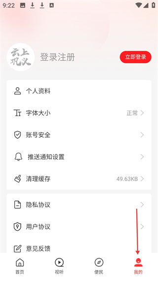 4、我的板塊可登錄注冊,管理個人資料、設置字體大小、賬號安全等,還能查看隱私協議、用戶協議并反饋意見。