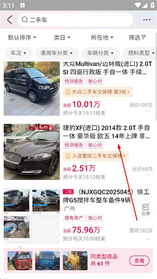 3、進入物品列表頁面后,可通過排序類目所在地等篩選條件縮小范圍,找到目標物品后點擊進入詳情頁,查看物品的價格車況等信息。