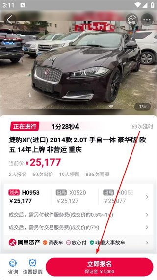 4、在物品詳情頁確認信息后點擊立即報名按鈕,按提示完成報名流程,可參與該物品的競買。