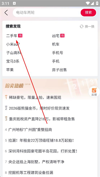 2、登錄后在主界面搜索欄輸入想要查找的物品關鍵詞,比如二手車,也可查看搜索發現里的推薦內容,選擇感興趣的分類進入對應物品列表頁面。