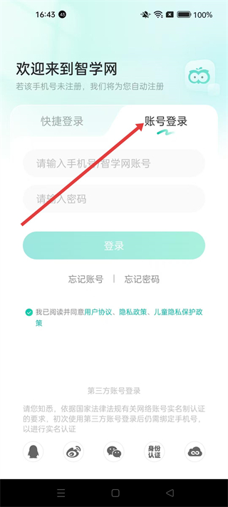 2、也可選擇賬號登錄,輸入手機號、智學網賬號和密碼,勾選協議后登錄,還可通過第三方賬號登錄,初次登錄需綁定手機號實名認證。