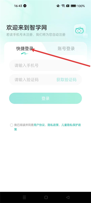 1、進入智學網可選擇快捷登錄,輸入手機號、驗證碼,勾選協議后點擊登錄,未注冊手機號將自動注冊,開啟學習服務。