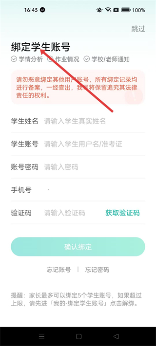 3、登錄后可綁定學生賬號,輸入學生姓名、賬號、密碼、手機號及驗證碼,點擊確認綁定,以便查看學情分析、作業情況等信息。