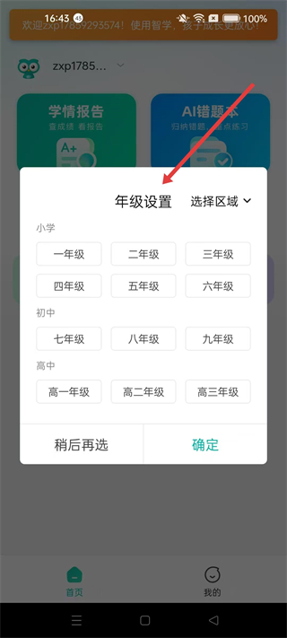 4、年級設置界面可選擇小學、初中、高中各年級,選擇區域后點擊確定,完成年級設置,以便平臺提供適配的學習內容和服務。