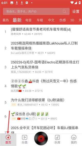 1、首頁,展示最新分類下多首DJ歌曲,如車載專用版DJ、越南語串燒等,底部首頁導航欄可瀏覽熱門音樂列表。