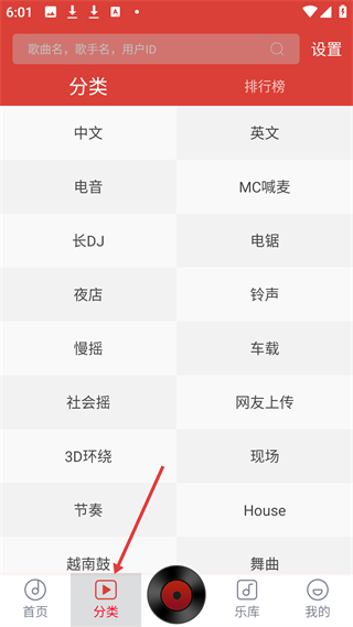 2、分類頁,有中文、英文、電音等多種音樂分類,還有長DJ、夜店等細分類型,底部分類導航欄篩選音樂風格。