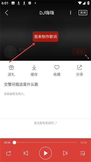 3、DJ嗨嗨歌曲詳情頁,有送禮、緩存等功能,還有我來制作歌詞互動選項,底部有播放控制欄。