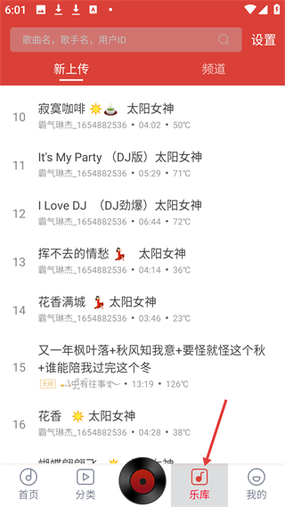 4、樂庫頁展示新上傳的寂寞咖啡等多首歌曲,標注時長和熱度,底部樂庫導航欄瀏覽最新音樂資源。