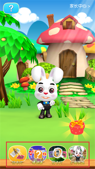 1、首頁,以童話場景呈現,含掃卡片、猜謎語等功能入口,設家長中心,是兒童互動游戲的聚合頁面。