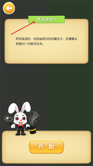 2、猜謎語功能的規則頁,說明聽完謎語掃對應魔法卡過關,展示規則后設開始按鈕,引導進入猜謎互動環節。
